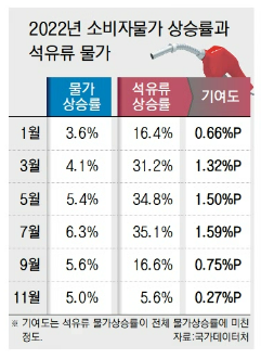 소비자물가를 구성하는 품목 중 석유류는 물가상승률이 2022년 3월 31.2%, 7월 35.1% 등으로 고공행진을 벌였다. 석유류는 전체 물가를 최대 1.74%포인트(P) 끌어 올렸다. 석유류 가격 상승이 없었다면 물가 상승률이 4∼6%대가 아니라 2∼4%대에 그쳤을 것이라는 뜻이다.
