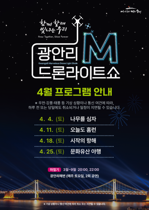 수영구는 “4월에는 계절성과 시의성에 맞춘 주제는 물론 한국의 아름다움을 국·내외 관광객들에게 소개하는 테마로 공연을 준비했다”며 “안전한 공연 환경 조성에도 만전을 기할 예정이니, 따뜻한 봄날 소중한 분들과 함께 오셔서 즐거운 추억 남기시기를 바란다”고 전했다.