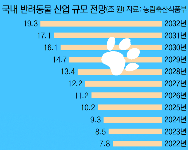 반려동물 관련 시장 규모도 매년 수직 상승하고 있다. 지난 2022년 7조 8000억 원 규모였던 펫 시장은 지난해 10조 원을 돌파한 것으로 추산된다. 2032년에는 19조 3000억 원까지 성장할 것으로 전망된다.