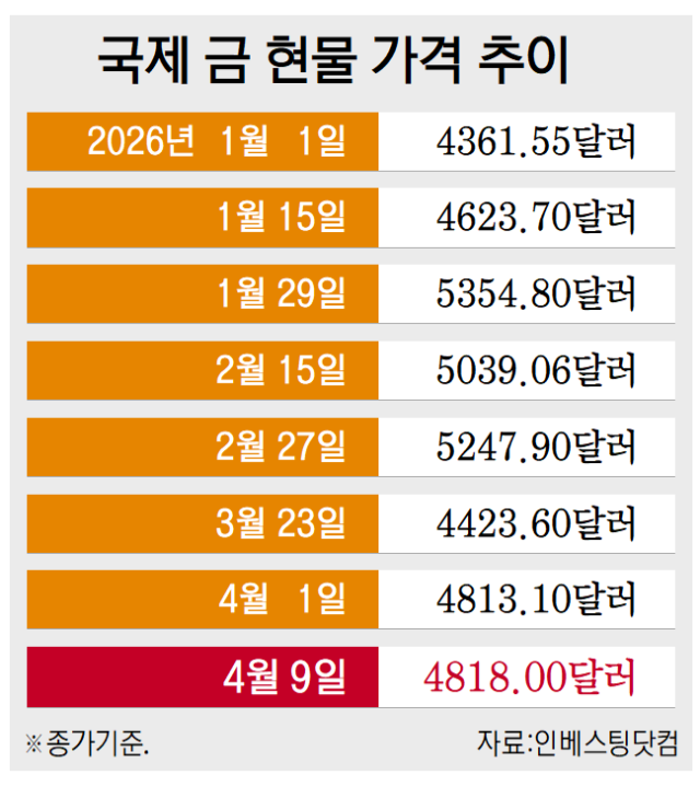 13일 인베스팅닷컴에 따르면 국제 금 현물가격은 지난 9일 종가 기준 4818.00달러를 기록했다. 1년 전과 비교하면 약 45%나 높은 수준이지만, 전쟁이 초기인 3월 2일과 비교하면 약 10%나 빠진 수준이다. 월간 기준으로는 2008년 글로벌 금융위기 이후 최대 낙폭이다.