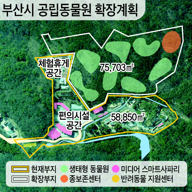 ‘더파크’ 소유권을 확보한 부산시가 공립 동물원으로 가기 위해 대대적인 부지 확장을 추진한다. 기존 5만 8000㎡에 배후 시유지 7만 5000㎡를 더해 다양한 시설로 자생력을 높이는 동시에 국비가 지원되는 거점 동물원 지정도 목표로 한다.
