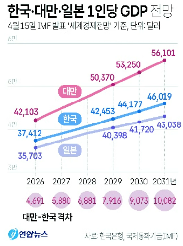 5년 뒤인 2031년에는 한국이 4만 6019달러, 대만이 5만 6101달러로, 양국의 차이가 1만 달러를 넘을 것으로 전망했다.