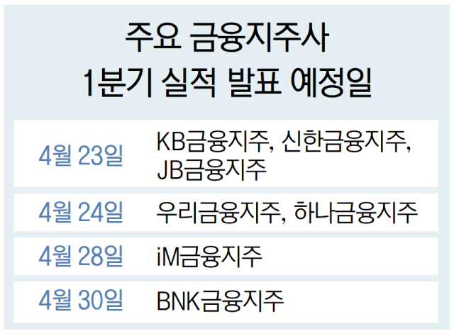 22일 금융권에 따르면 23일부터 이달 말까지 올해 1분기 실적 발표가 이어질 예정이다. 먼저 KB금융과 신한금융, JB금융이 23일에 실적을 발표하며, 다음 날인 24일 하나금융과 우리금융이 실적을 내놓는다. iM금융은 28일, BNK금융은 30일 실적 발표를 예고했다.