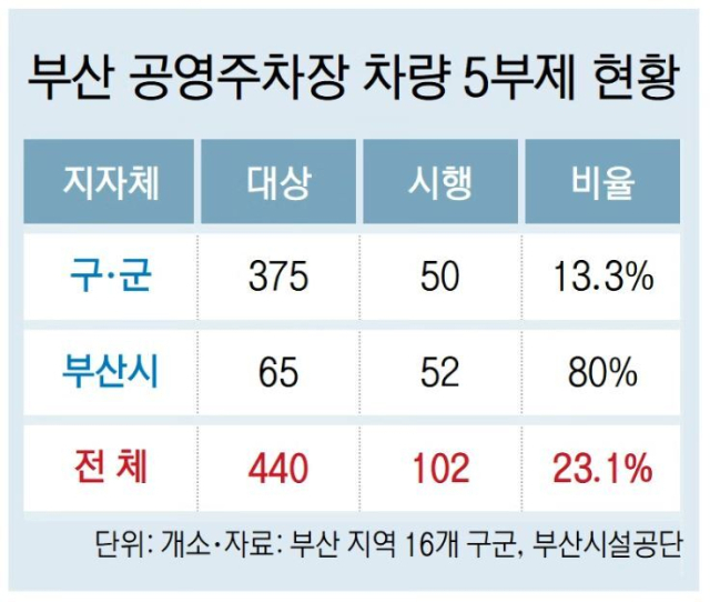 부산시는 이런 지적에 구·군에 5부제 추가 시행을 독려하고 있다. 실제로 부산 지역 5부제 시행 공영주차장 수는 지난 20일 81개소에서 20개소 늘어났다.